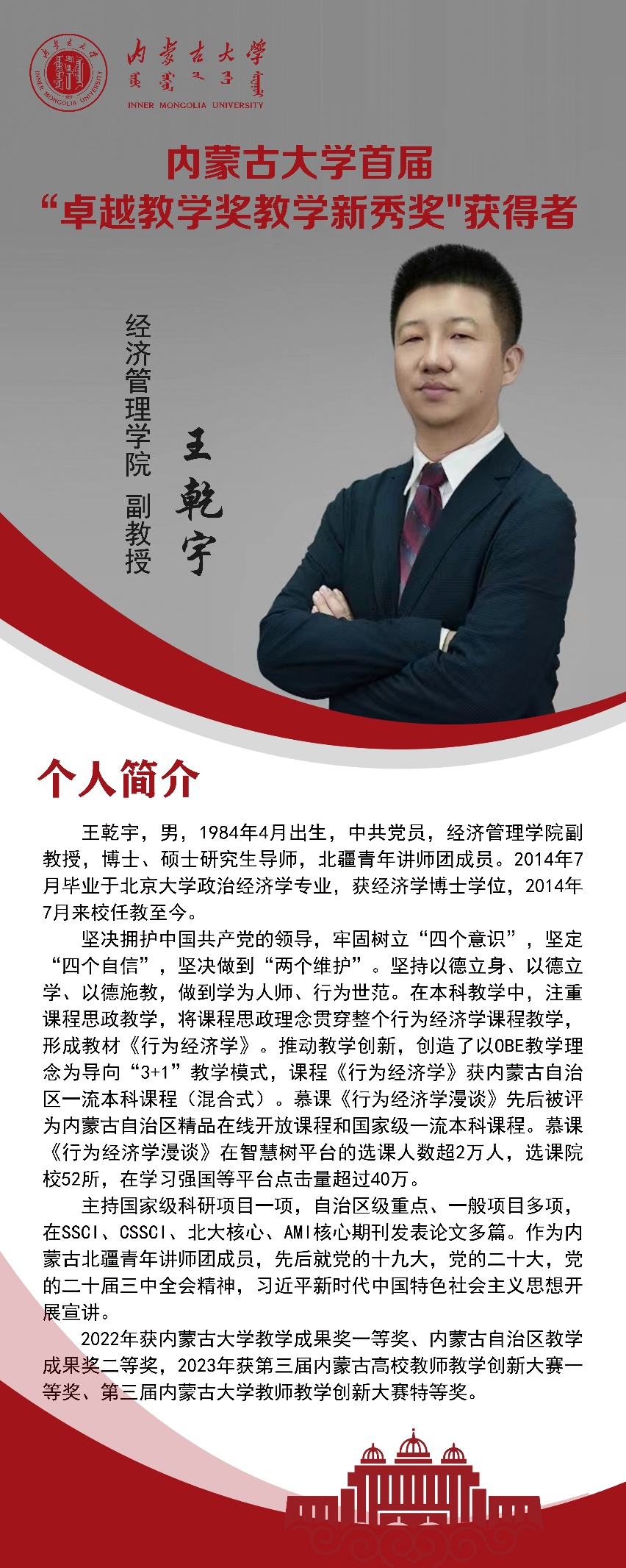 澳门十大网投正规官网平台首届卓越教学新秀奖获得者——王乾宇副教授