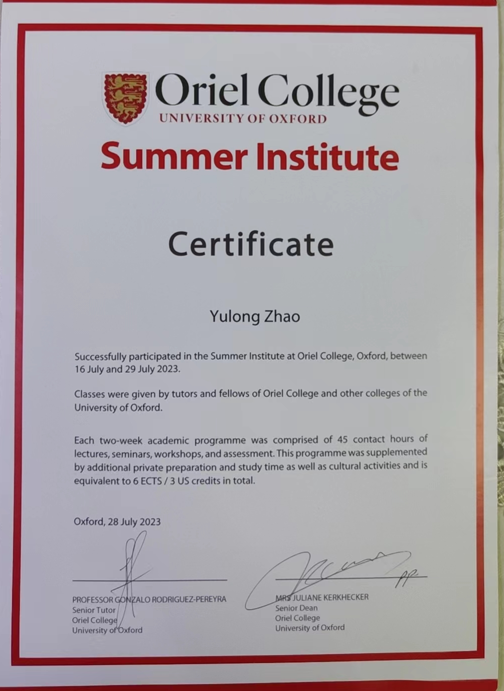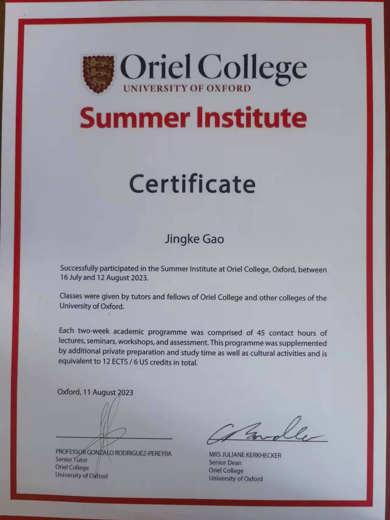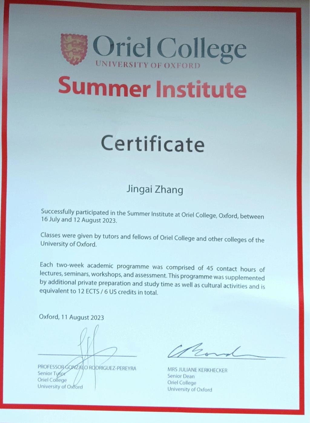 9名访学学生具体修读课程情况是:5名学生选了《Economics of Public Policy》;3名学生选了《Economics of Public Policy S》和《Knowledge and Reality》;1名学生选了《Knowledge and Reality》和《Introduction of Finance》。学生通过加强与教授和同学的交流沟通,克服语言恐惧,精进学业,逐渐适应了牛津访学生活,最终全部取得课程合格证书。牛津大学学分按1.5 ECTS/3 US credits认定(ECTS,European Credit Transfer System欧洲学分互认体系,是欧洲各个国家间在高等教育领域互相衔接的学分系统),澳门十大网投正规官网平台学分转换办法按已报备学校教务处的《内蒙古大学澳门十大网投正规官网平台本科生赴牛津大学奥利尔学院暑期访学学分认定办法》执行。