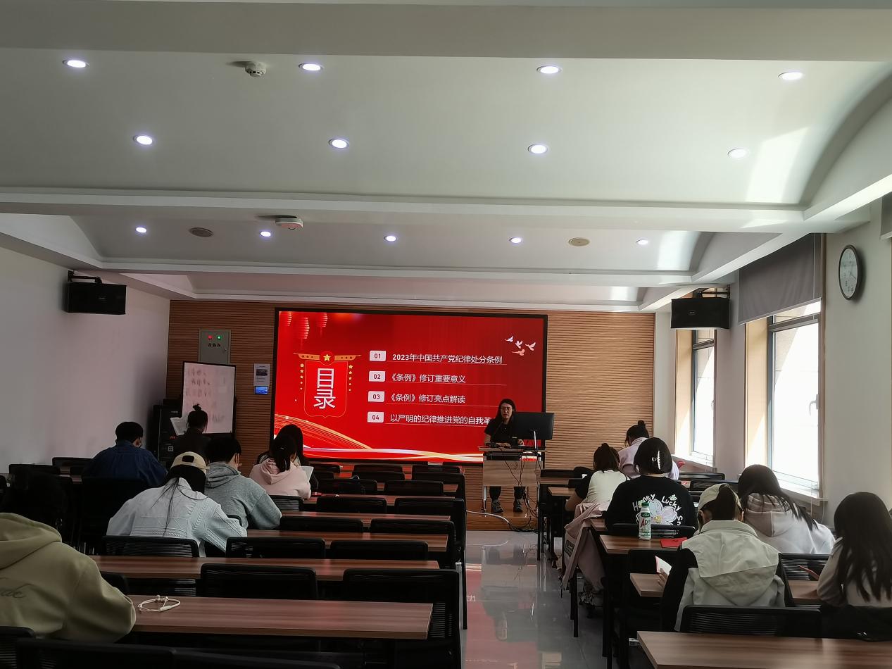 开展党纪学习教育是加强党的纪律建设、推动全面从严治党向纵深发展的重要举措。李安琪老师首先向全体党员传达了学院党纪学习教育实施方案和相关工作安排,并就支部党纪学习教育工作作了安排部署。随后,她带领全体党员围绕中共中央新修订的《中国共产党纪律处分条例》展开学习研讨。支部党员共同领会了《条例》修订的重要意义,对《条例》的新增内容和修订亮点进行了深入的分析解读,准确把握了《条例》的内涵要义和实践要求。李安琪老师指出支部党员同志要认真学习理解《条例》,切实增强自身的纪律意识和规矩意识,更加深刻领悟“两个确立”的决定性意义、更加坚决做到“两个维护”。