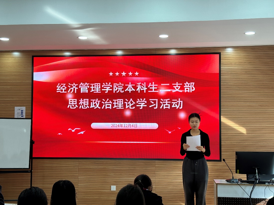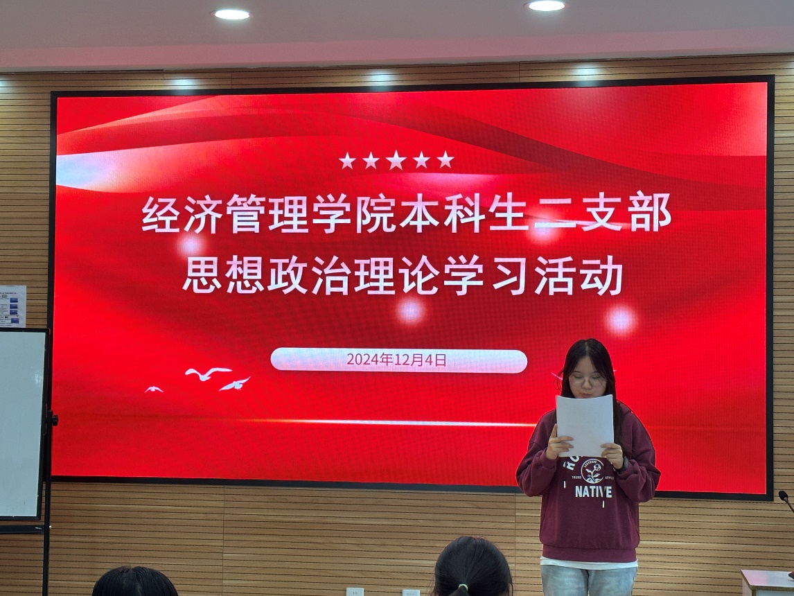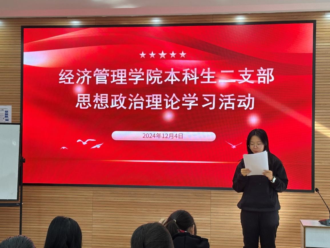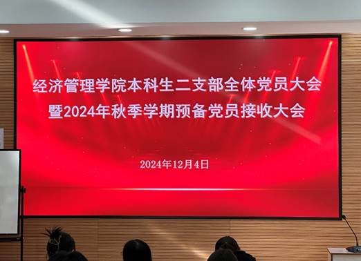 2024年12月4日下午,澳门十大网投正规官网平台本科生二支部在知行楼(经管楼)309教室开展了12月思想政治理论学习会议暨2024年秋季学期预备党员接收大会,支部全体党员参加了会议。