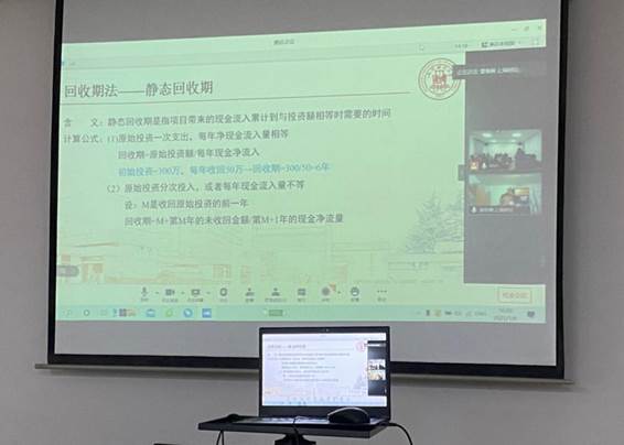 接着曹雅楠博士进行了《投资项目资本预算》课程的讲解,首先讲解基本含义、计算公式以及优缺点四个方面评价独立项目的四种方法——净现值法(净现值和现值指数)、内含报酬率法、回收期法(静态回收期和动态回收期)以及会计报酬率法。在介绍完每种评价方法之后用具体案例来加深理解,并比较说明每种评价方法的适用情形。最后,以表格形式总结比较项目评价方法,加深记忆。