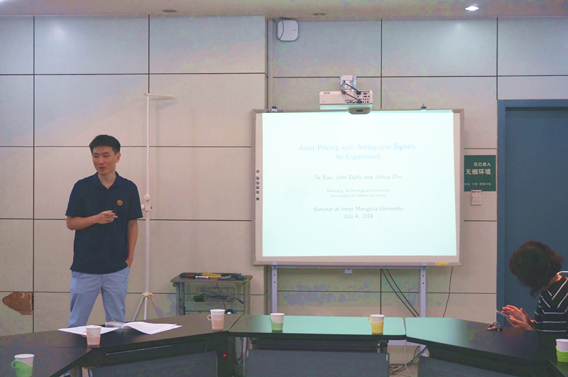 2019年7月4日上午9时,新加坡南洋理工大学助理教授包特博士,应邀为十大网投正规官网师生作了题为“Asset Pricing with Ambiguous Signals: An Experiment”的学术报告。报告会由金融系主任梁斌副教授主持,参加报告会的有杜凤莲院长、彭长桂教授、陈胜蓝教授、许红梅博士、吴晓华老师以及学院相关专业本科生和研究生。