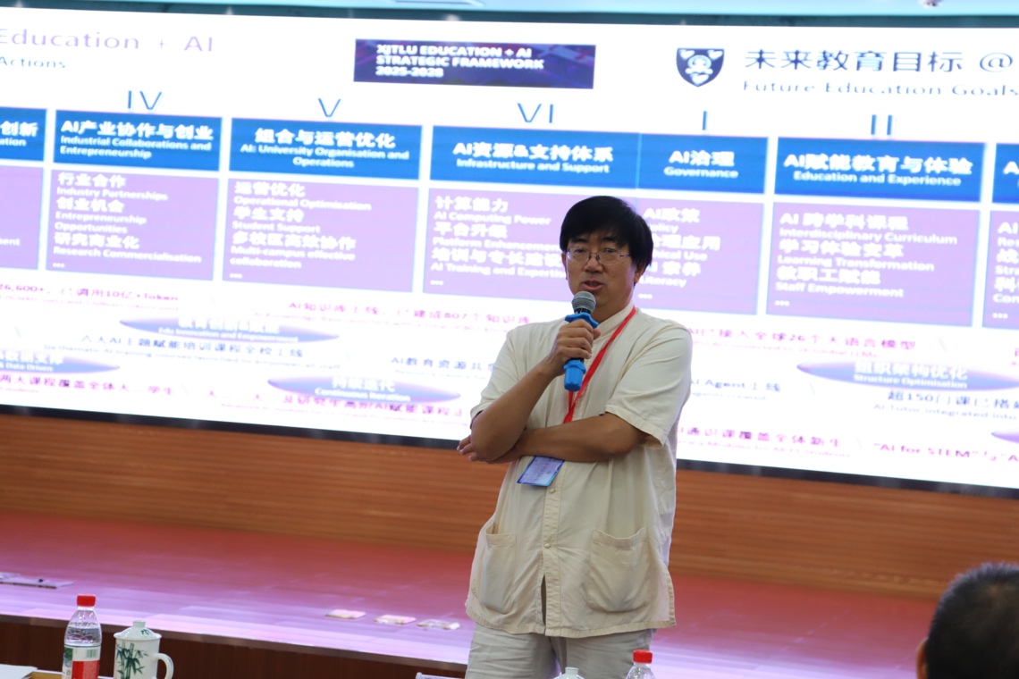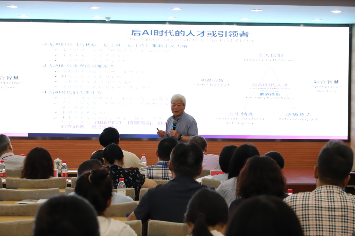 上午的主题报告环节中,大会主席席酉民教授以“后AI时代的‘智能’领导力:和谐心智与融合智慧”为题发表主旨演讲。席教授基于“和谐管理模型”,系统阐述了后AI时代领导者与人才的核心素养框架,着重阐释了“和谐心智”的价值内涵与“融合智慧”的实践路径。清华大学罗家德教授在点评中高度认同这一理论体系,并进一步探讨了AI时代如何彰显人的独特价值与创造性优势。